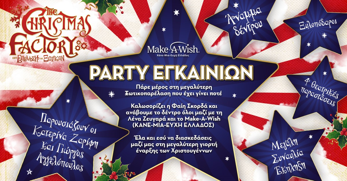 Στις 30 Νοεμβρίου το πιο αγαπημένο θεματικό πάρκο όλων των παιδιών και των μεγάλων, το The Christmas Factory και η Επέλαση των Ξωτικών επιστρέφει για ακόμη μια χρονιά στην καρδιά της πόλης, στην Τεχνόπολη Δήμου Αθηναίων, με ένα μεγάλο party εγκαινίων!