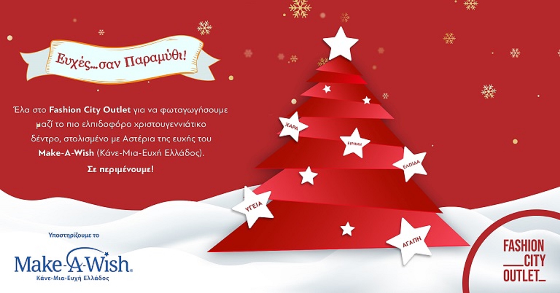 Το φετινό δέντρο του Fashion City Outlet είναι το πιο ελπιδοφόρο χριστουγεννιάτικο δέντρο, καθώς είναι στολισμένο αποκλειστικά με το Αστέρι της Ευχή του Make-A-Wish (Κάνε-Μια-Ευχή Ελλάδος).