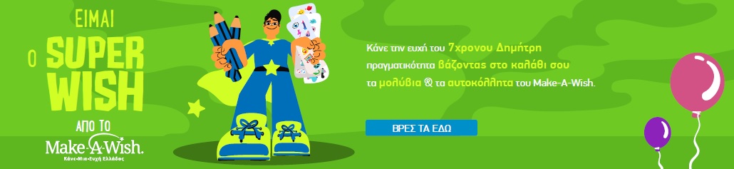 Συγκεκριμένα, όλα τα έσοδα από τις πωλήσεις μολυβιών και αυτοκόλλητων του Make-A-Wish που θα βρείτε στο website του δημοφιλούς ηλεκτρονικού super market, θα διατεθούν για την εκπλήρωση της ευχής του 7χρονου Δημήτρη που πάσχει από λευχαιμία.