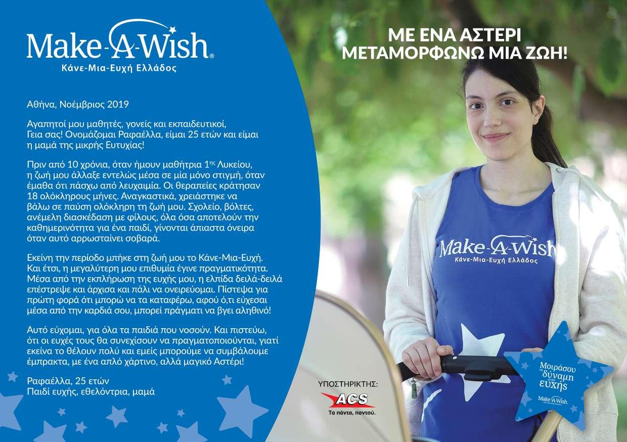 Ένα χάρτινο αστέρι εδώ και 21 χρόνια «ταξιδεύει» σε ελληνικά σχολεία με την έγκριση του Υπουργείου Παιδείας και μεταφέρει ξεχωριστά μηνύματα αγάπης και αισιοδοξίας. Είναι το Αστέρι της Ευχής του Make-A-Wish (Κάνε-Μια-Ευχή Ελλάδος) και για πρώτη φορά φέτος, με την κινητοποίηση να έχει ξεπεράσει κάθε προηγούμενο, ο Οργανισμός θα καταφέρει να αποστείλει ενημερωτικό υλικό σε όλα τα σχολεία της χώρας μας.